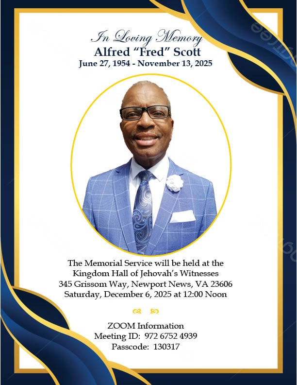 The memorial service for Alfred “Fred” Scott will be held at the Kingdom Hall of Jehovah’s Witnesses 345 Grissom Way Newport News, VA 23606 Saturday December 6, 2025 at 12pm. If you are unable to attend in person, the service will be available on Zoom. Information is available below.