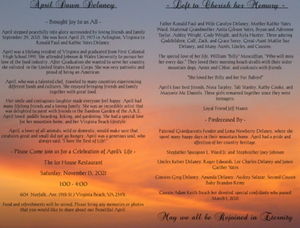 A celebration of April’s life will be held at The Ice House Restaurant on Saturday, November 13, 2021 from 1:00-4:00PM.
