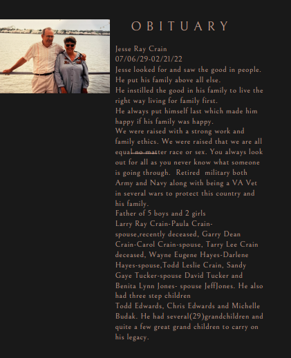 Larry Ray Crain-Paula Crain-spouse, recently deceased, Garry Dean Crain-Carol Crain-spouse, Tarry Lee Crain deceased, Wayne Eugene Hayes-Darlene Hayes-spouse, Todd Leslie Crain, Sandy Gaye Tucker-spouse David Tucker and Benita Lynn Jones- spouse Jeff Jones.